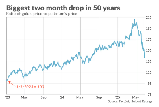 赫伯特的同事迈拉·塞丰(Myra Saefong)近期就曾探讨过,可能存在某些特殊因素导致黄金铂金比自4月以来大幅下跌。但鉴于该比率过去两个月的跌幅之大,任何因素似乎无法完全解释黄金和铂金近期的走势——而无论如何,这都意味着未来数月美股前景显著恶化。